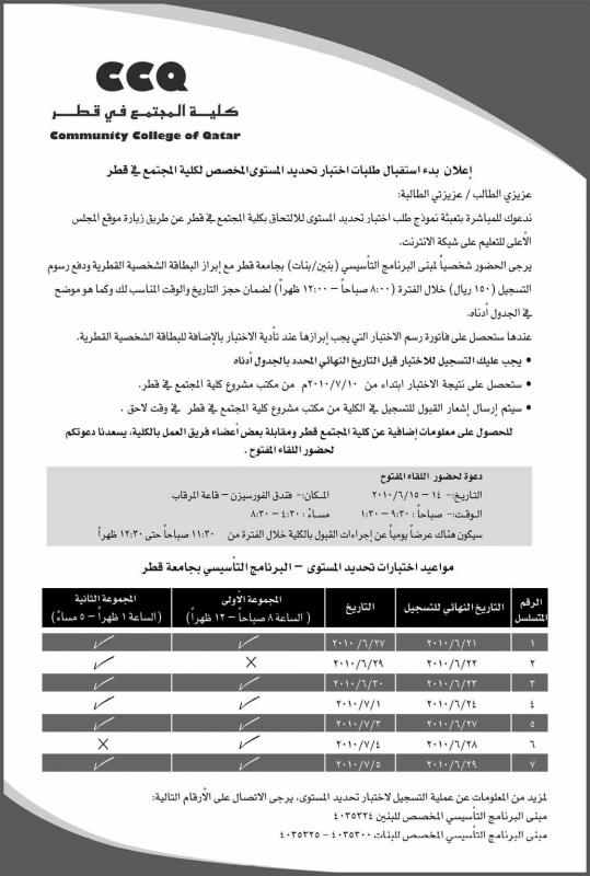 اختبارات تحديد المستوى بكلية المجتمع في قطر 21 الجاري